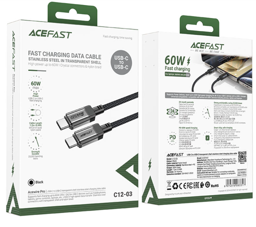 ايس فاست كابل شحن من تايب سي الي تايب سي بغطاء شفاف من الفولاذ المقاوم للصدأ - أسود C12-03 - يدعم الشحن السريع حتى 60 واط.