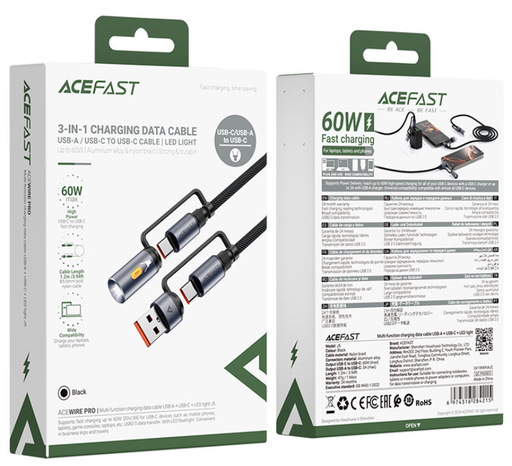 ايس فاست - كابل شحن متعدد الوظائف ( تايب سي الي تايب سي و تايب سي الي يو اس بي مع اضاءة LED